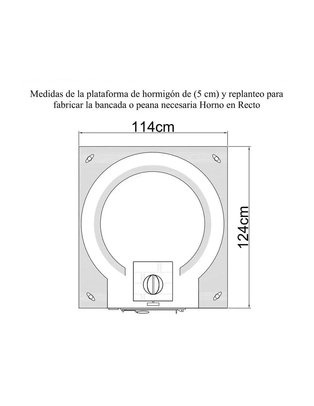 Cada horno va montado sobre una plataforma de hormigón H-250 de 5 cm de espesor, armado con mallazo de 100#100#100. El acabado exterior de la plataforma es liso con los bordes biselados. Así mismo dispone de 4 anclajes con cáncamos cincados roscados de Ø 16 mm que sirven para la colocación del horno por elevación. Una vez que el horno está instalado los cáncamos pueden retirarse.
