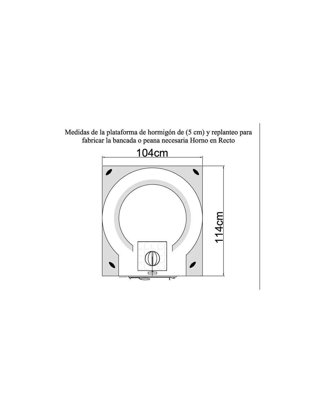 Cada horno va montado sobre una plataforma de hormigón H-250 de 5 cm de espesor, armado con mallazo de 100#100#100. El acabado exterior de la plataforma es liso con los bordes biselados. Así mismo dispone de 4 anclajes con cáncamos cincados roscados de Ø 16 mm que sirven para la colocación del horno por elevación. Una vez que el horno está instalado los cáncamos pueden retirarse.