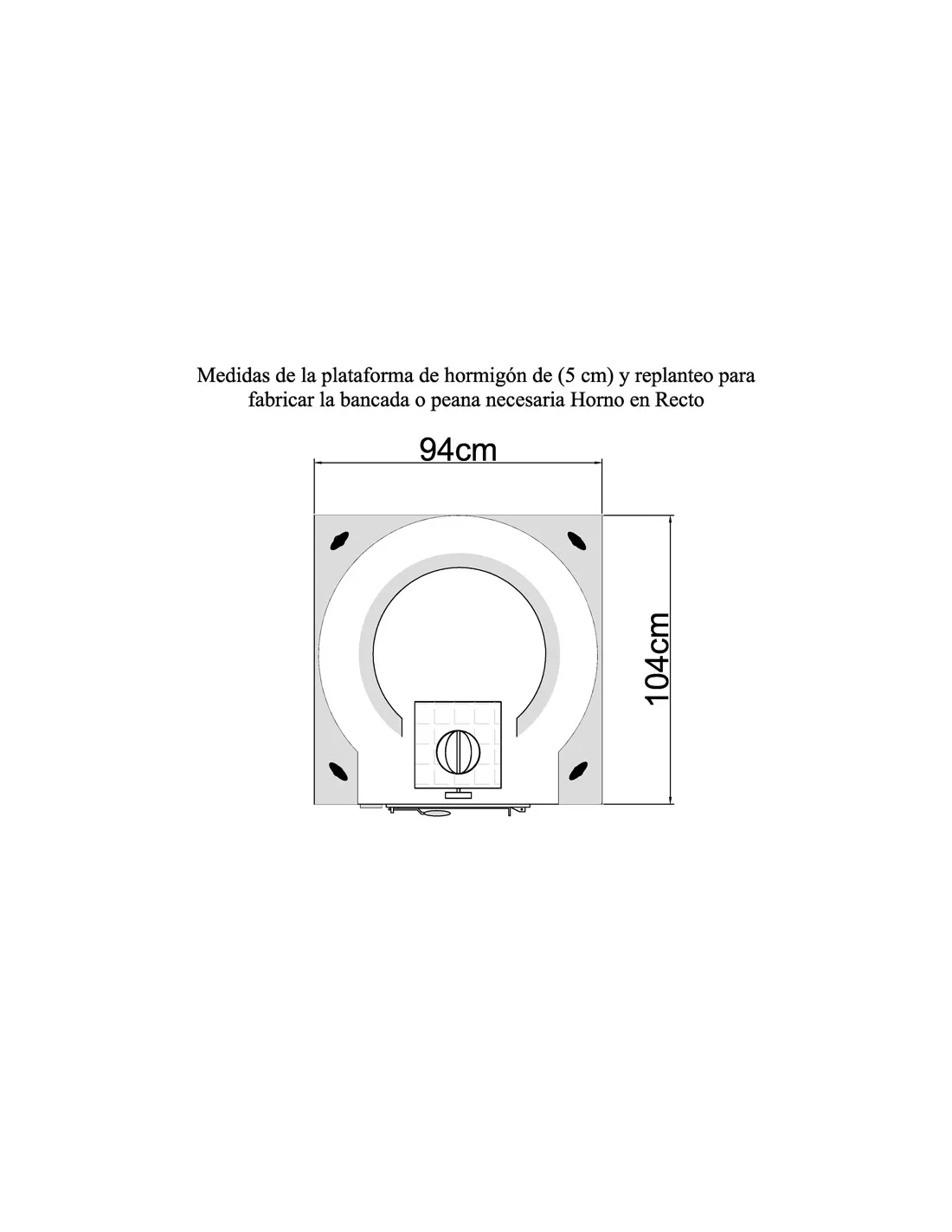 Cada horno va montado sobre una plataforma de hormigón H-250 de 5 cm de espesor, armado con mallazo de 100#100#100. El acabado exterior de la plataforma es liso con los bordes biselados. Así mismo dispone de 4 anclajes con cáncamos cincados roscados de Ø 16 mm que sirven para la colocación del horno por elevación. Una vez que el horno está instalado los cáncamos pueden retirarse.