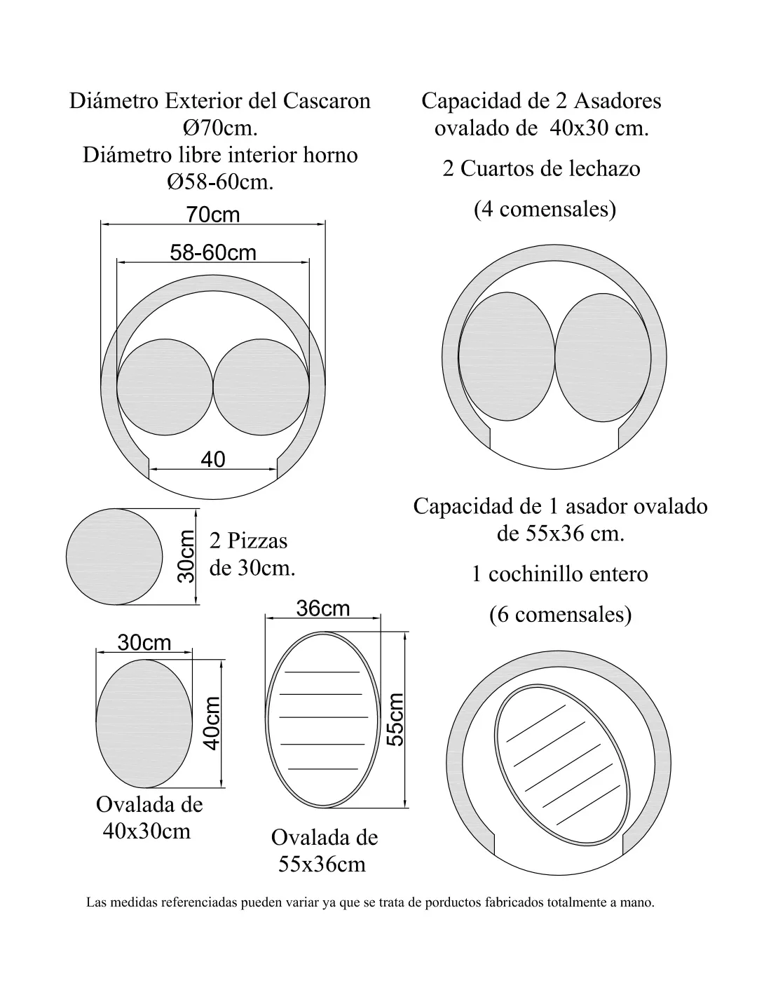 Los modelos tradicionales se fabrican en medidas 70 - 80 - 90 - 100 - 110 - 120 - 130 - 140 - 150 cm y BUNKER en 86 y 96 cm. Las medidas hacen referencia al diámetro exterior de la base de la cúpula refractaria (ver la tabla de arriba)