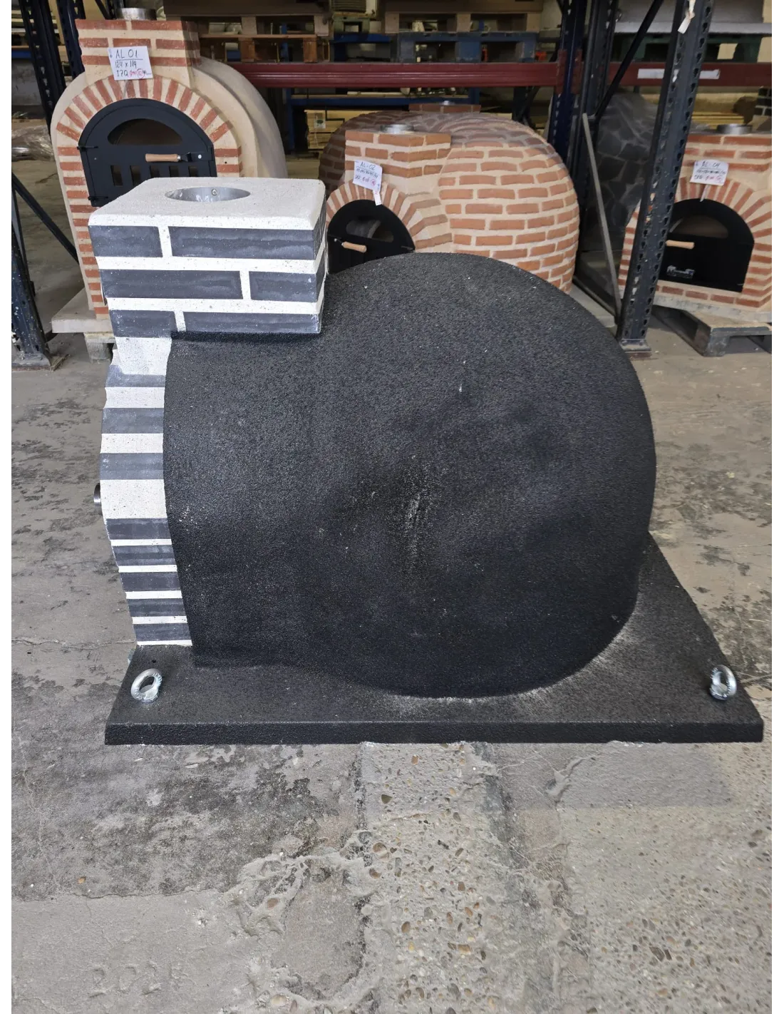 Cada horno va montado sobre una plataforma de hormigón H-250 de 5 cm de espesor, armado con mallazo de 100#100#100. El acabado exterior de la plataforma es liso con los bordes biselados. Así mismo dispone de 4 anclajes con cáncamos cincados roscados de Ø 16 mm que sirven para la colocación del horno por elevación. Una vez que el horno está instalado los cáncamos pueden retirarse.