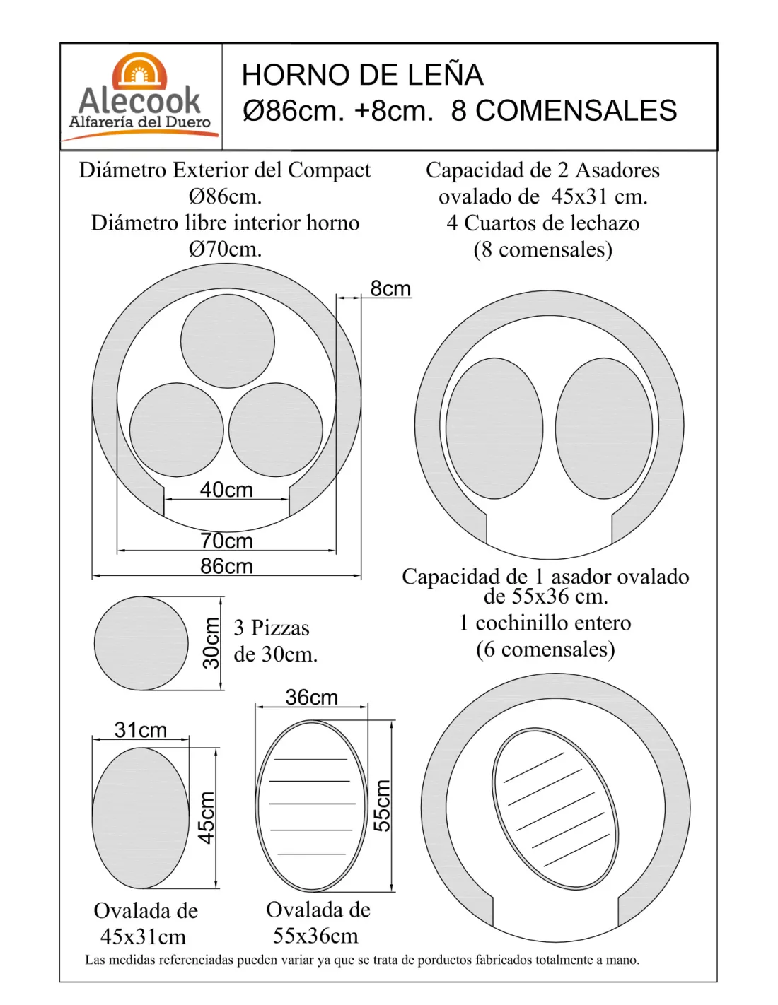 Los modelos tradicionales se fabrican en medidas 70 - 80 - 90 - 100 - 110 - 120 - 130 - 140 - 150 cm y BUNKER en 86 y 96 cm. Las medidas hacen referencia al diámetro exterior de la base de la cúpula refractaria (ver la tabla de arriba)