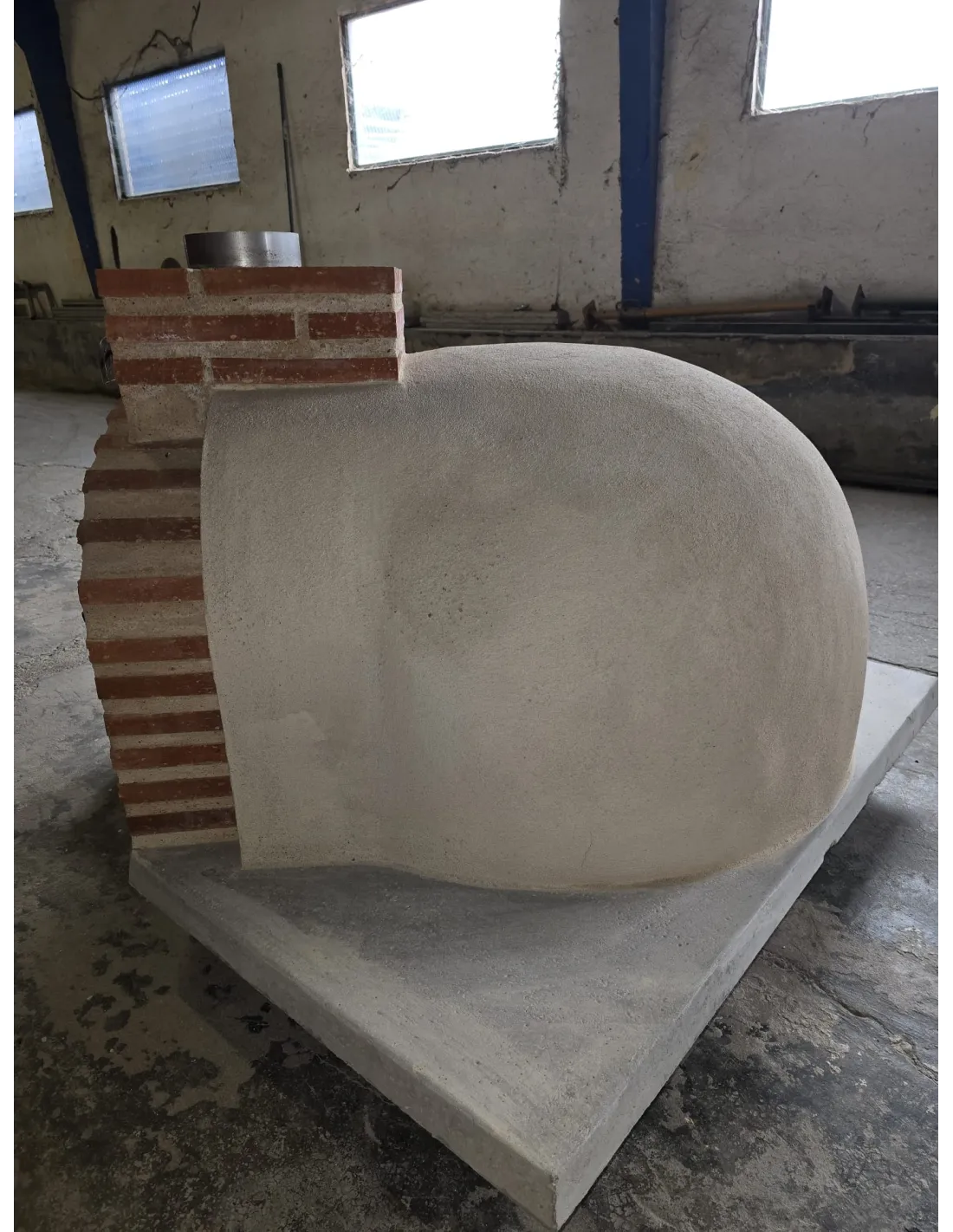 Cada horno va montado sobre una plataforma de hormigón H-250 de 5 cm de espesor, armado con mallazo de 100#100#100. El acabado exterior de la plataforma es liso con los bordes biselados. Así mismo dispone de 4 anclajes con cáncamos cincados roscados de Ø 16 mm que sirven para la colocación del horno por elevación. Una vez que el horno está instalado los cáncamos pueden retirarse.