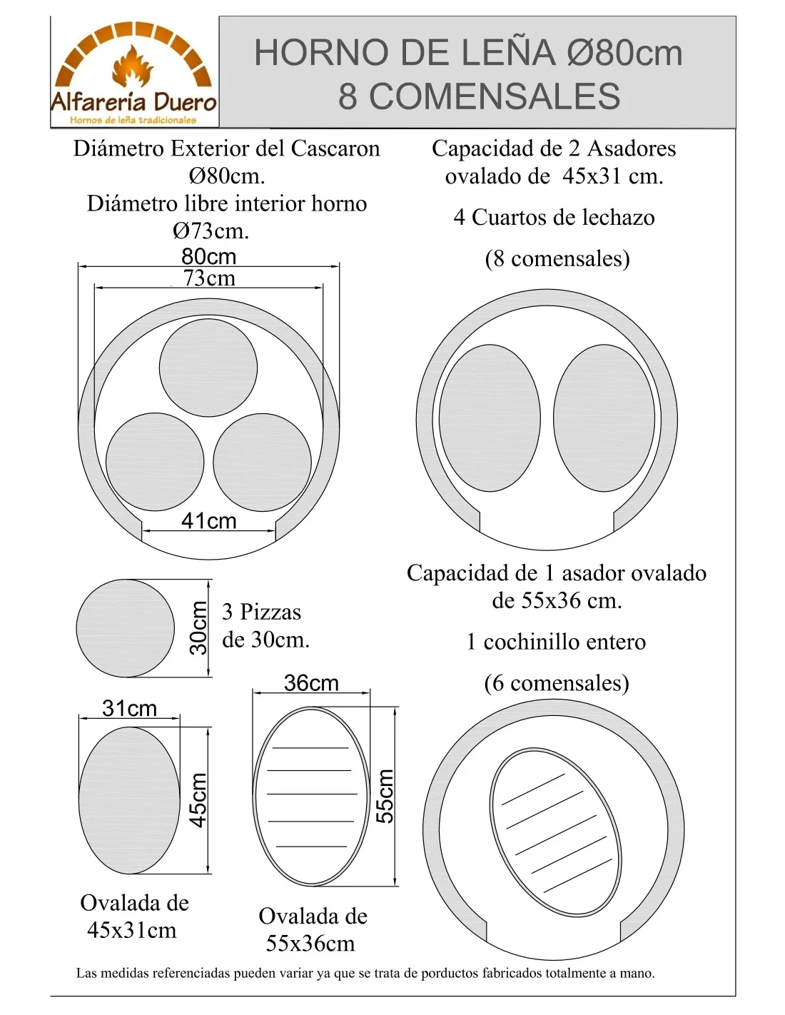 Los modelos tradicionales se fabrican en medidas 70 - 80 - 90 - 100 - 110 - 120 - 130 - 140 - 150 cm y BUNKER en 86 y 96 cm. Las medidas hacen referencia al diámetro exterior de la base de la cúpula refractaria (ver la tabla de arriba)