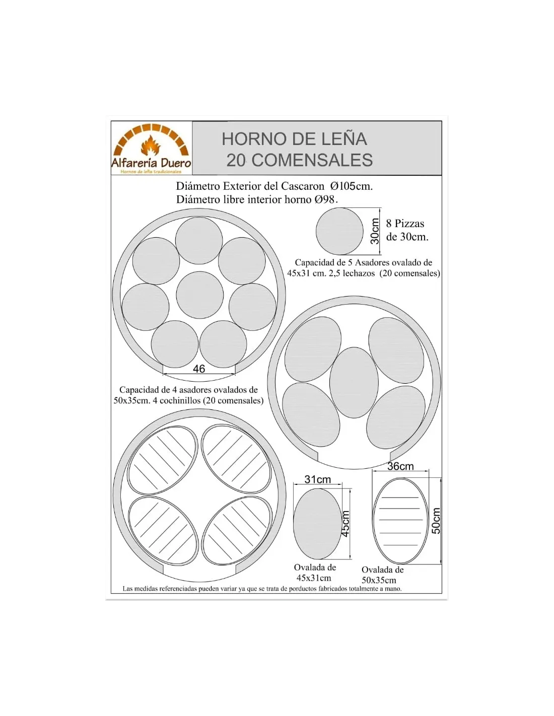 Hay dos modalidades: "Tradicional" se trata de un horno con base y cúpula de una sola pieza fabricados a mano de forma artesanal, sus paredes tienen un grosor de 4 cm aproximadamente. Y el modelo "BUNKER" que se fabrica de forma industrial y se compone de dos piezas independientes (base y cúpula) que están compuestas por caolín prensado a 160 tn, las paredes de los hornos Bunker tienen 8 centímetros de espesor. VER MODELOS BUNKER